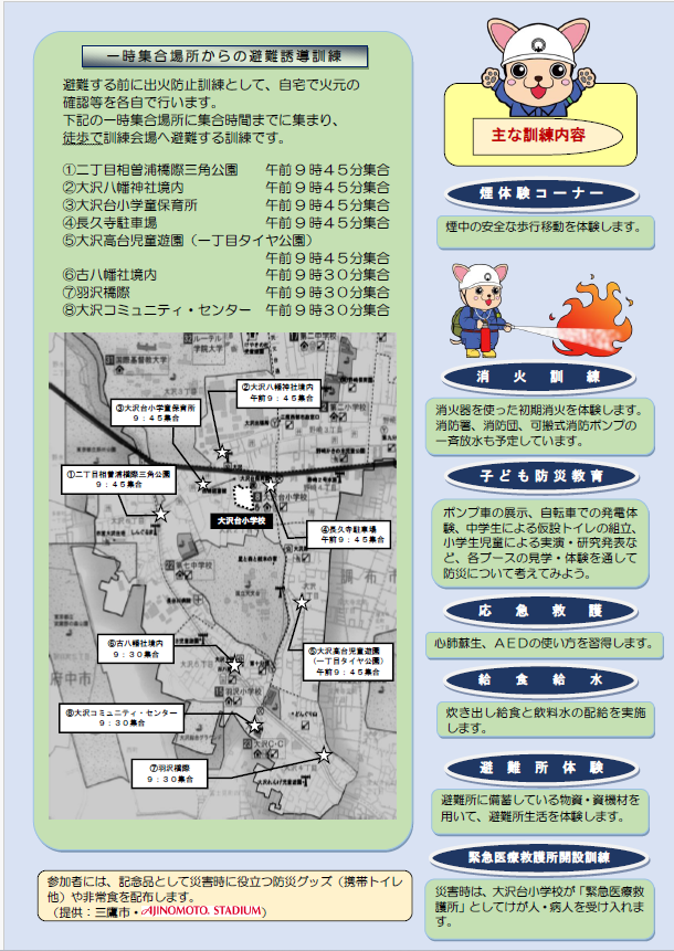 首都圏での巨大地震が、いつ起きても不思議ではないと言われています。いざというときに、自分や家族の命、そしてこのまちを守るために平常時からの備えが大切です。総合防災訓練では、防災行動力を身に着けられる様々のコーナーをご用意しています。 ご家族やご近所の皆様でお誘いあわせて、是非ご参加ください。